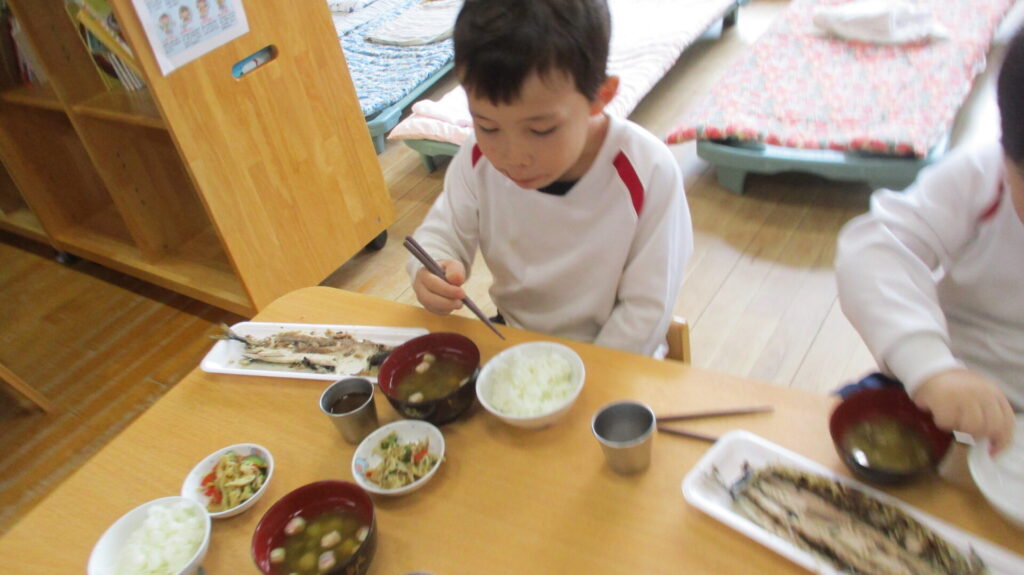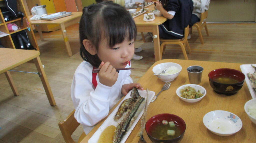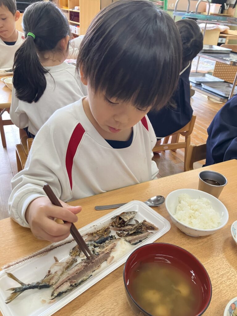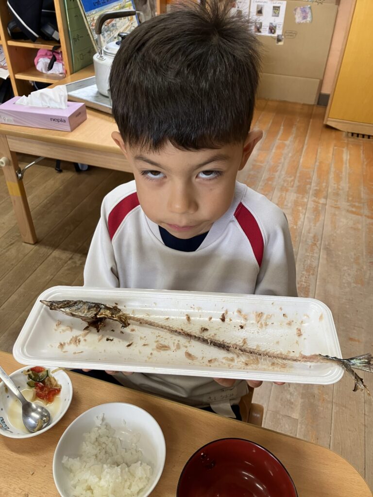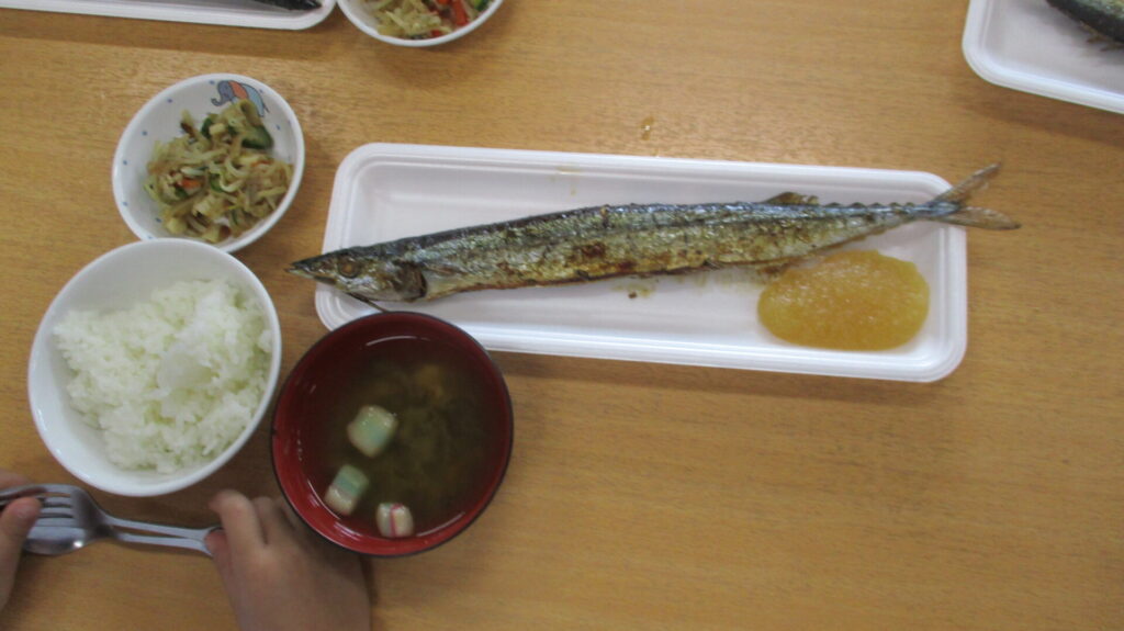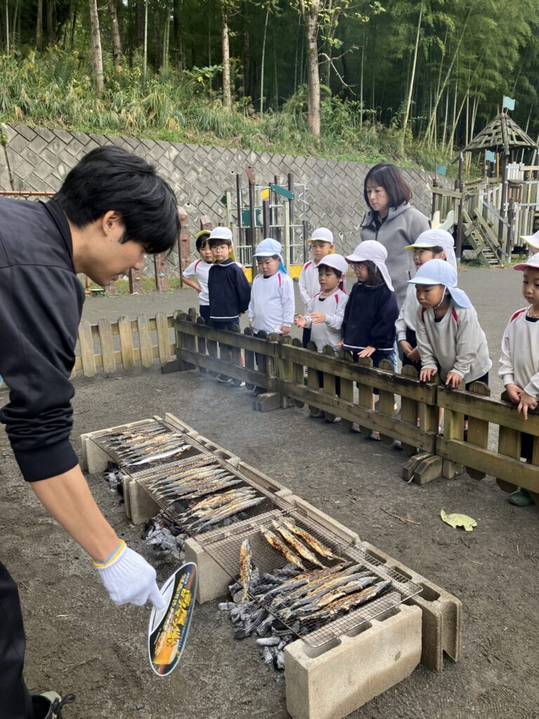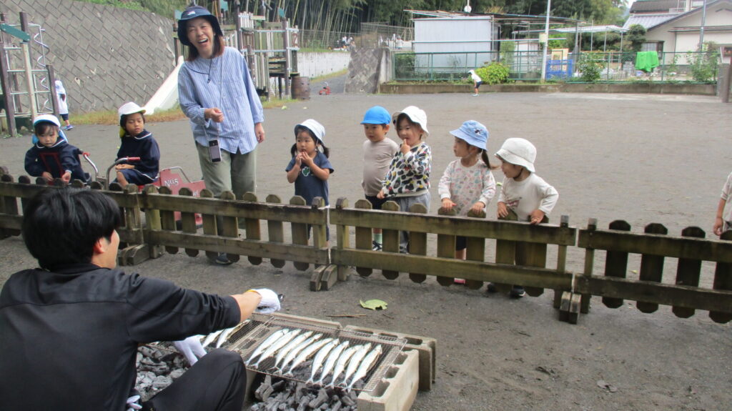 園庭に出てきた順に、香り漂うさんまの前に…。