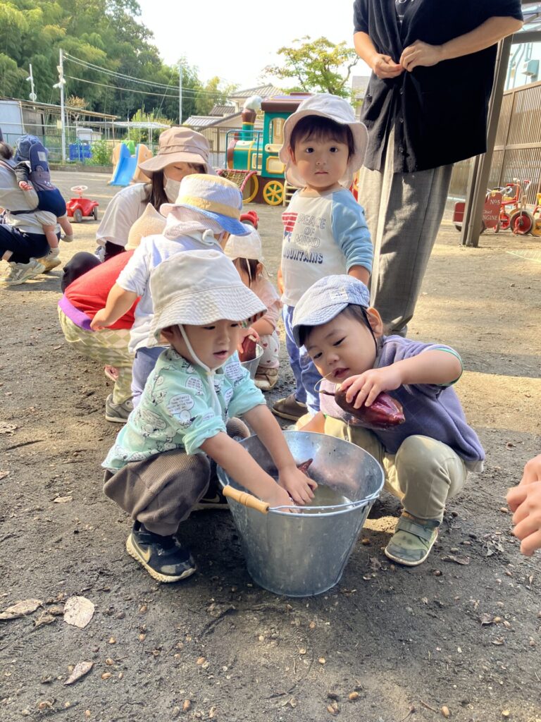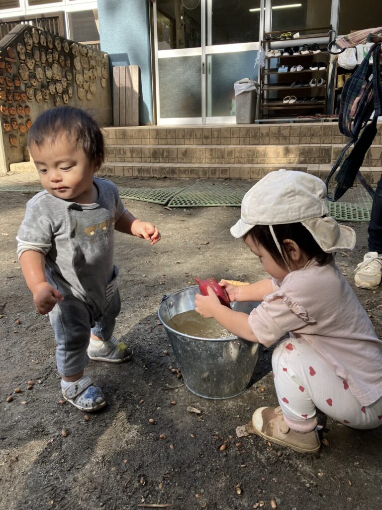 明日の準備! calendar_today 2025年10月29日 明日は、みんなが楽しみにしている『焼き芋会』です。 焼き芋会の前に、お芋をきれいに洗います。 小さいクラスの子ども達も、お芋洗いを手伝ってくれました。(お芋を洗って…水遊びになるのは、小さい子あるあるですね) 明日が、楽しみです。