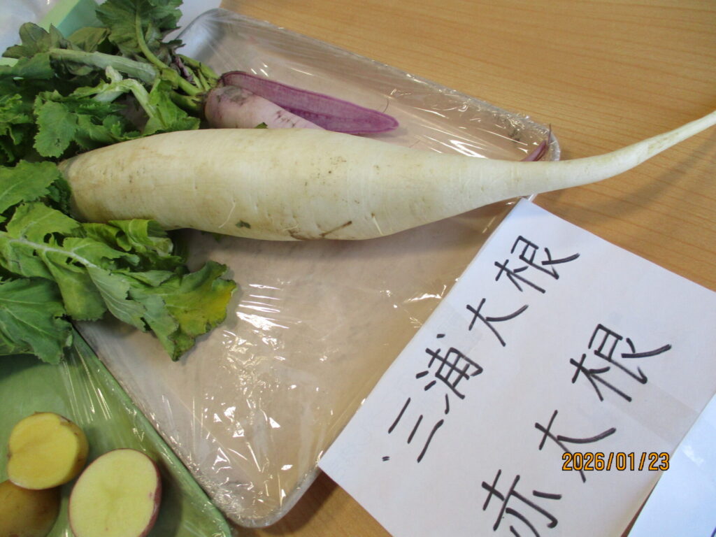 本日、給食にて提供した大根と胡瓜のツナ和えで使用した大根は、園の畑で採れた三浦大根と赤大根を使用しました。