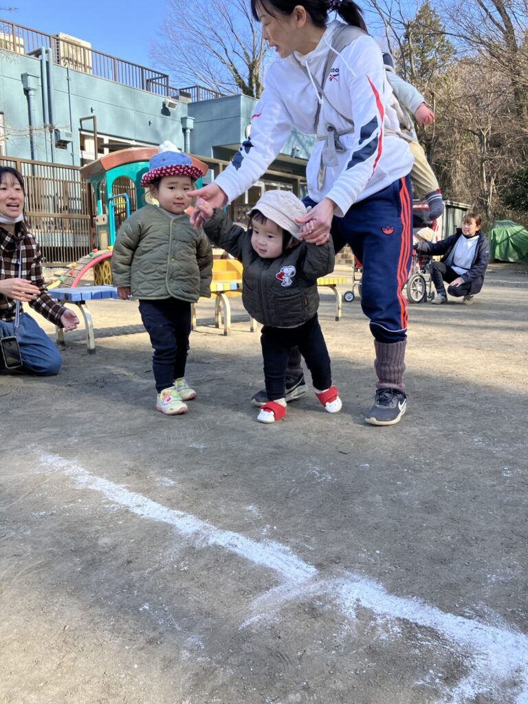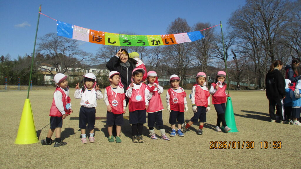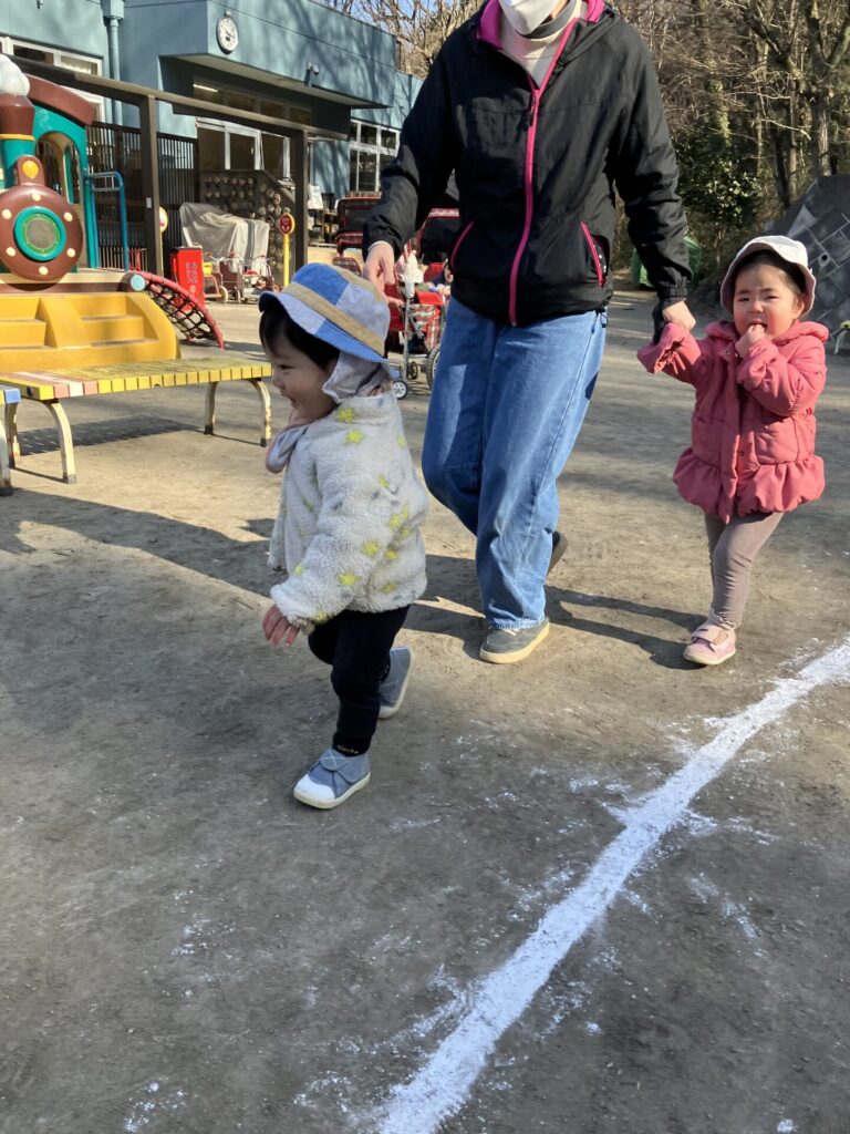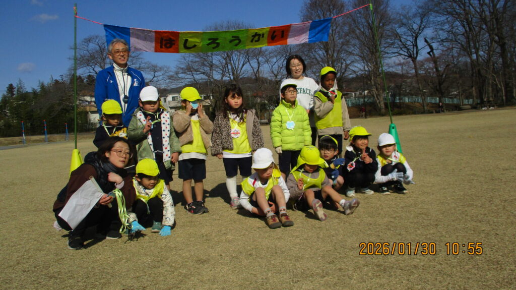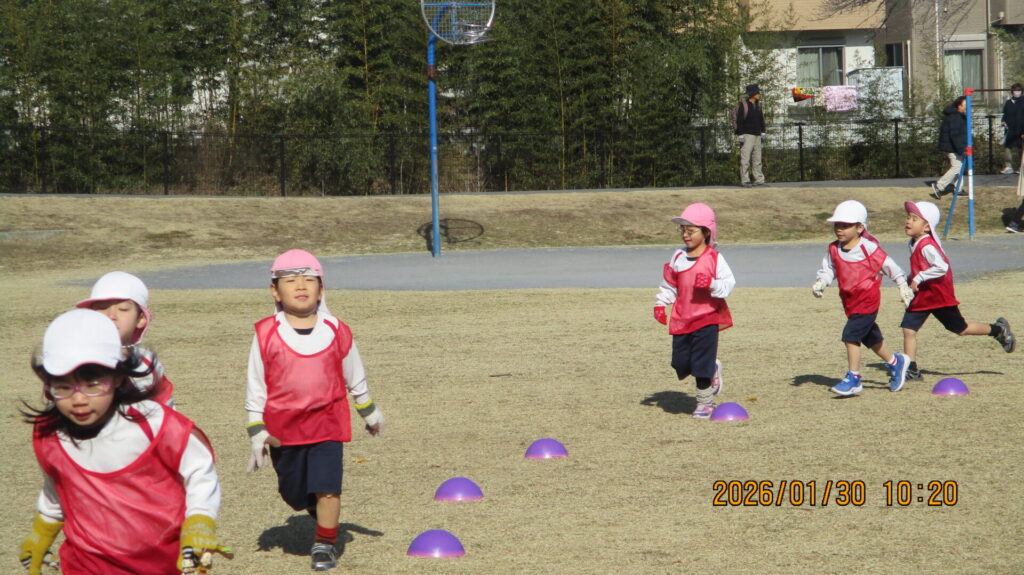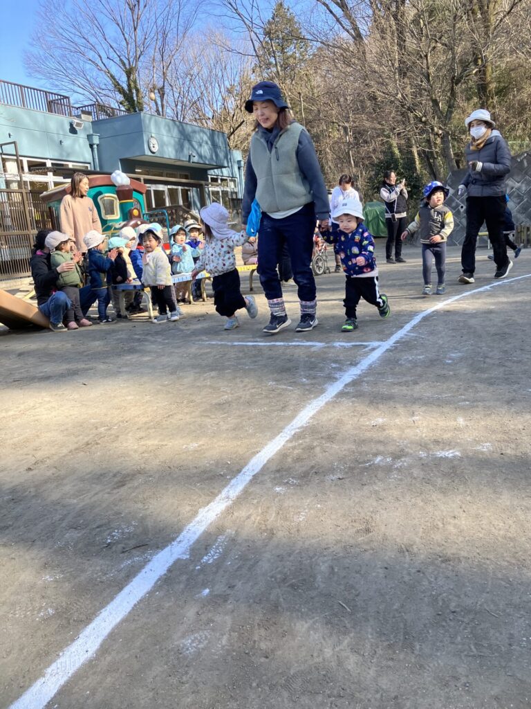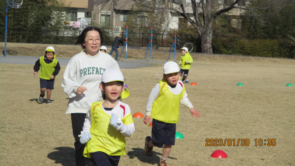 乳児ぐみは園庭で、幼児組は小田野中央公園の仲良し広場で元気いっぱい走りました。