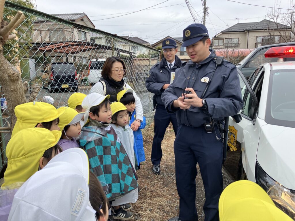 交番のおまわりさんには、警察手帳や手錠を見せてもらいました。テレビの中でしか見たことのない物に、子ども達は興味深々でした。防弾チョッキにも触らせてもらいました。