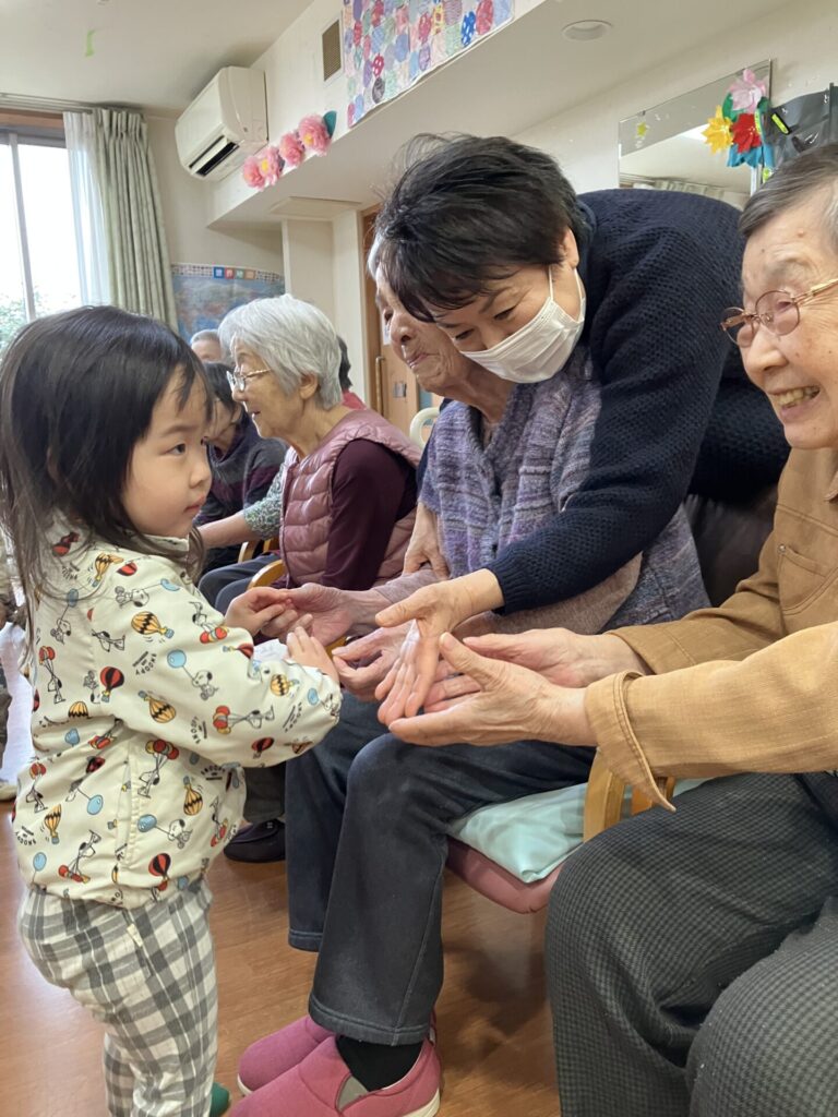 子ども達が来るのを、楽しみに待っていて下さった、おじいちゃんやおばあちゃんと握手をしたりハグをして触れ合いました。中には「可愛いね」と言って涙を流す方もいらっしゃいました。