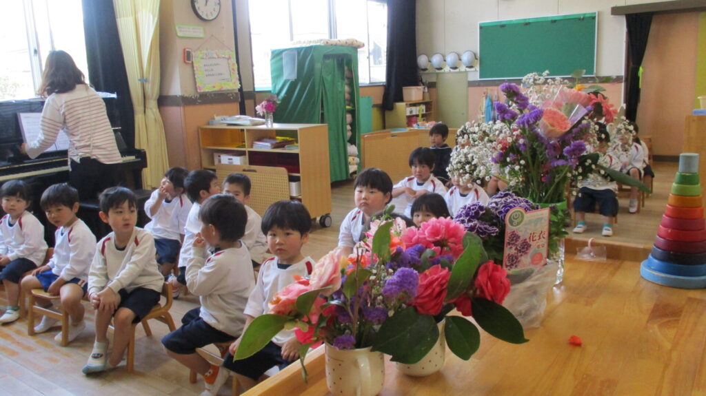 カーネーやションやバラ、つつじ、ゆきやなぎ、かすみそうなどたくさんのお花が並びました。