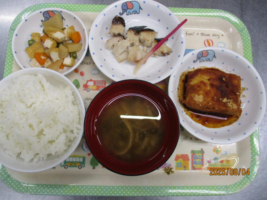 ぶりの塩焼き calendar_today 2025年8月4日 給食:ご飯 みそ汁 ぶりの塩焼き 厚揚げの煮物 おやつ:わらびもち風 今日は非常に暑く、40℃に迫る気温で屋外活動がためらわれる1日でした。 本日の喫食状況ですが、全体的に良く食べていました。ぶりの塩焼きは、はじかみをのせて提供しました。園でもたまにしか使わない 食材なので一口かじってみたりと興味を持つ子が何人かいました。
