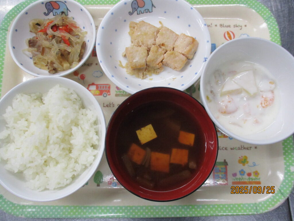 かじきのバター醤油がけ calendar_today 2025年9月25日 給食:ご飯 みそ汁 かじきのバター醤油がけ チャプチェ おやつ:フルーツヨーグルト 本日は雲が多く晴れ間が少なかったものの、湿度がそれほど高くなく風も吹いていたので過ごしやすい 1日でした。 今日の喫食状況ですが全体的に良く食べていました。特にかじきのバター醤油がけはバターの風味が食欲を そそり、ほとんど残食はありませんでした。