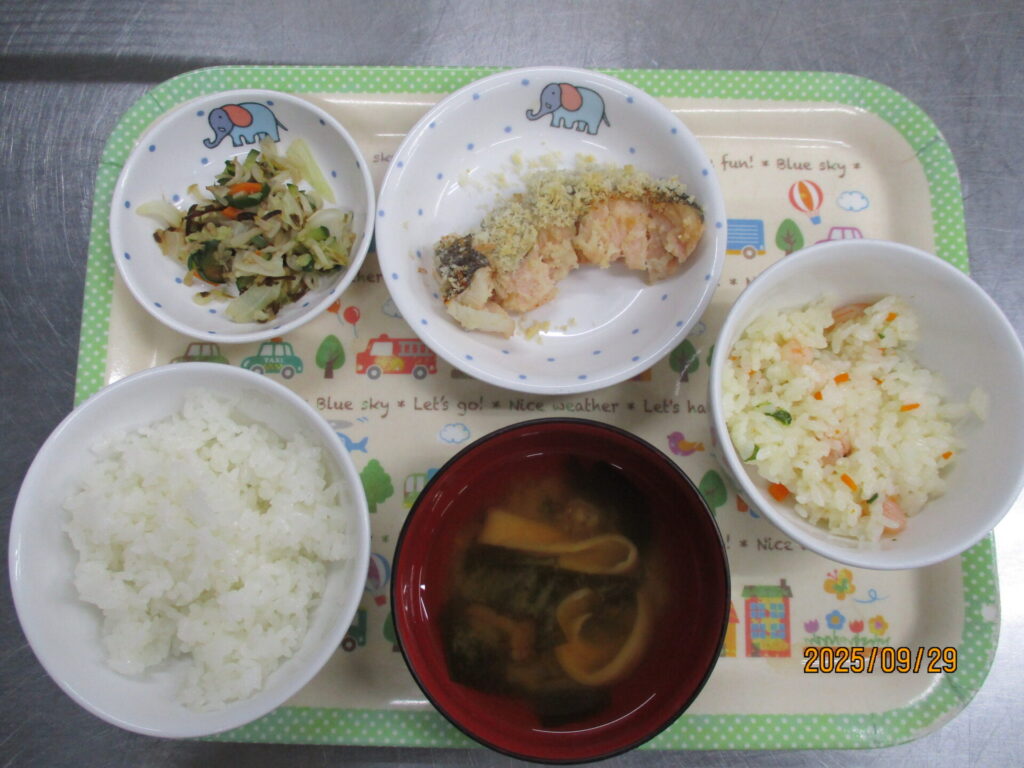 えびピラフ calendar_today 2025年9月29日 給食:ご飯 みそ汁 たらのパン粉焼き きゃべつの塩昆布和え おやつ:えびピラフ 今日の給食のたらのパン粉焼きは、下味にケチャップが入っていてパン粉のチーズとの塩味とも相性抜群で良く食べていました。塩昆布和えは少し残食多めでした。おやつのえびピラフも良く食べていて残食ほとんどありませんでした。