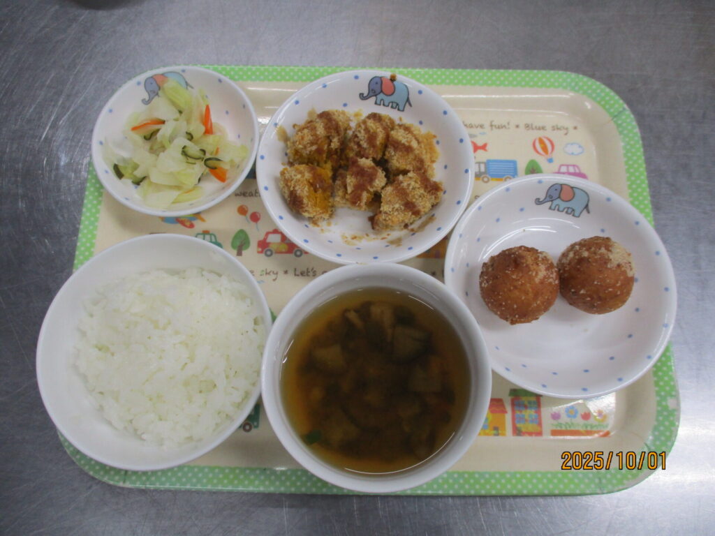 かぼちゃコロッケ calendar_today 2025年10月1日 給食:ご飯 みそ汁 かぼちゃコロッケ 三色サラダ おやつ:ドーナツ 今日の給食では揚げないかぼちゃコロッケの提供でした。パン粉にサラダ油をしみ込ませて何度かローストし、1個ずつ衣を付けて焼き上げました。途中裏表をひっくり返す事によりさっくり感が増し、揚げたコロッケのような仕上がりに!子供たちも美味しそうに食べてくれて、残食が多くなりがちなかぼちゃですが、今日は良く食べていました。サラダの残食は少し多めです。