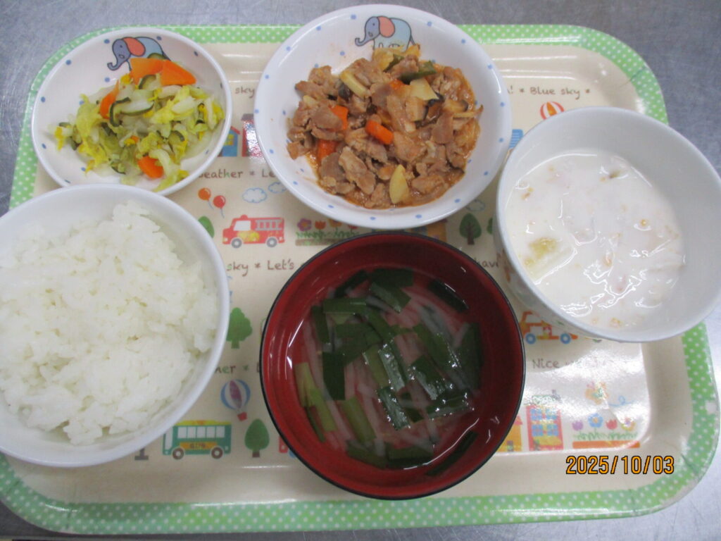 給食:ご飯 にらのスープ 酢豚風煮 白菜の甘酢和え