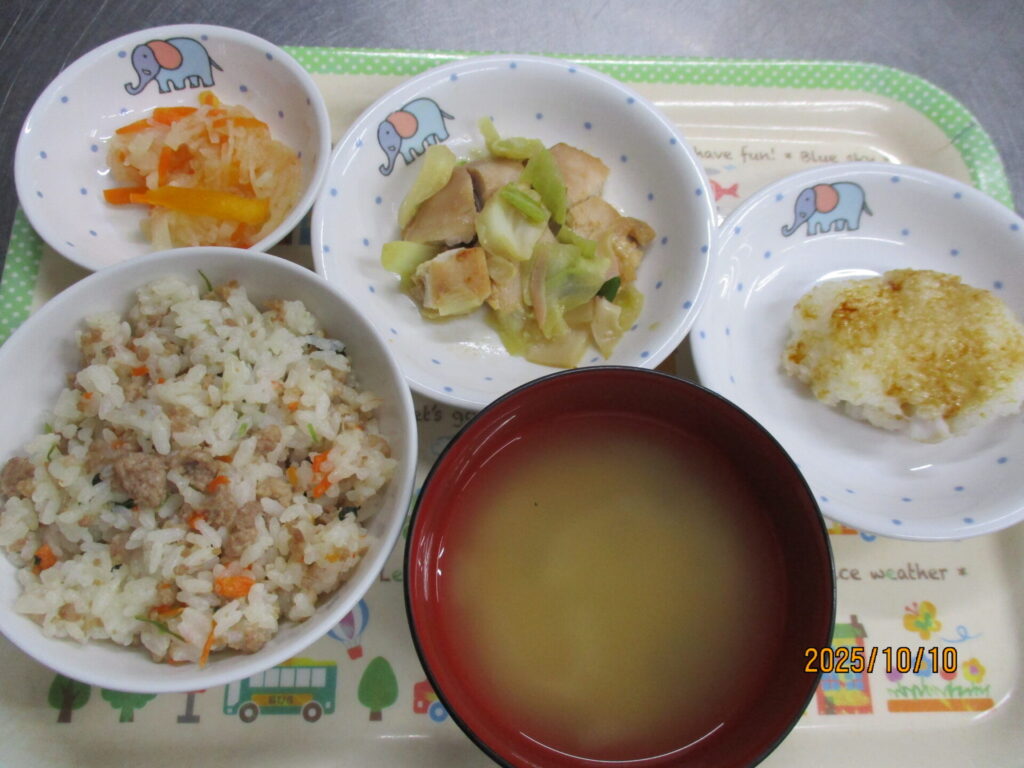 本日の給食は岐阜県の郷土料理の提供でした。友禅ごはんは甘辛く煮た挽肉と三つ葉の入った混ぜご飯です。すったて汁はすり潰した大豆がたっぷりと入った汁物で、濁った見た目ですが味はすっきりとしています。鶏ちゃんは味噌ベースの味付けで、野菜たっぷり!柿なますは大根と人参に柿がプラスされています。すったて汁は少し残食が多かったですが、ご飯・鶏ちゃん・なますは良く食べていました。