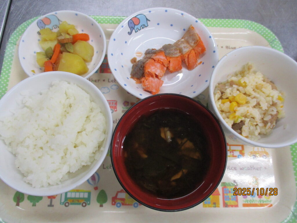秋の味覚たっぷり! calendar_today 2025年10月28日 お昼ごはん:ご飯、みそ汁(赤みそ)、鮭の塩焼き、さつま芋の煮物 おやつ:チャーハン 今日のお昼ご飯は、舞茸や鮭やさつま芋と秋の味覚たっぷりの献立でした。 舞茸入りの赤だしは、毎月一回赤みその日があって みんな、だいぶ赤みそになれてきたようで残食は少なめでした 鮭の塩焼きは、安定のほぼ完食でした さつま芋の煮物も甘くて良く食べていました