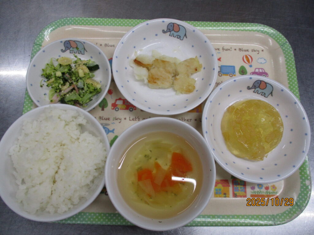 今日の給食は洋風メニューでの提供でした。かれいのムニエルは柔らかくて食べやすく、残食ほとんどありませんでした。チョップドサラダはたっぷりの野菜とチーズ、ハムも入った具だくさんのサラダです。普段サラダの残食は多いのですが、今日は少なく良く食べていました。おやつのりんごゼリーはりんごをコロコロにカットして、甘く煮てコンポートのように調理してからゼリーの中に入れました。いつもと少し違うりんごゼリー、多くの子が完食でした。