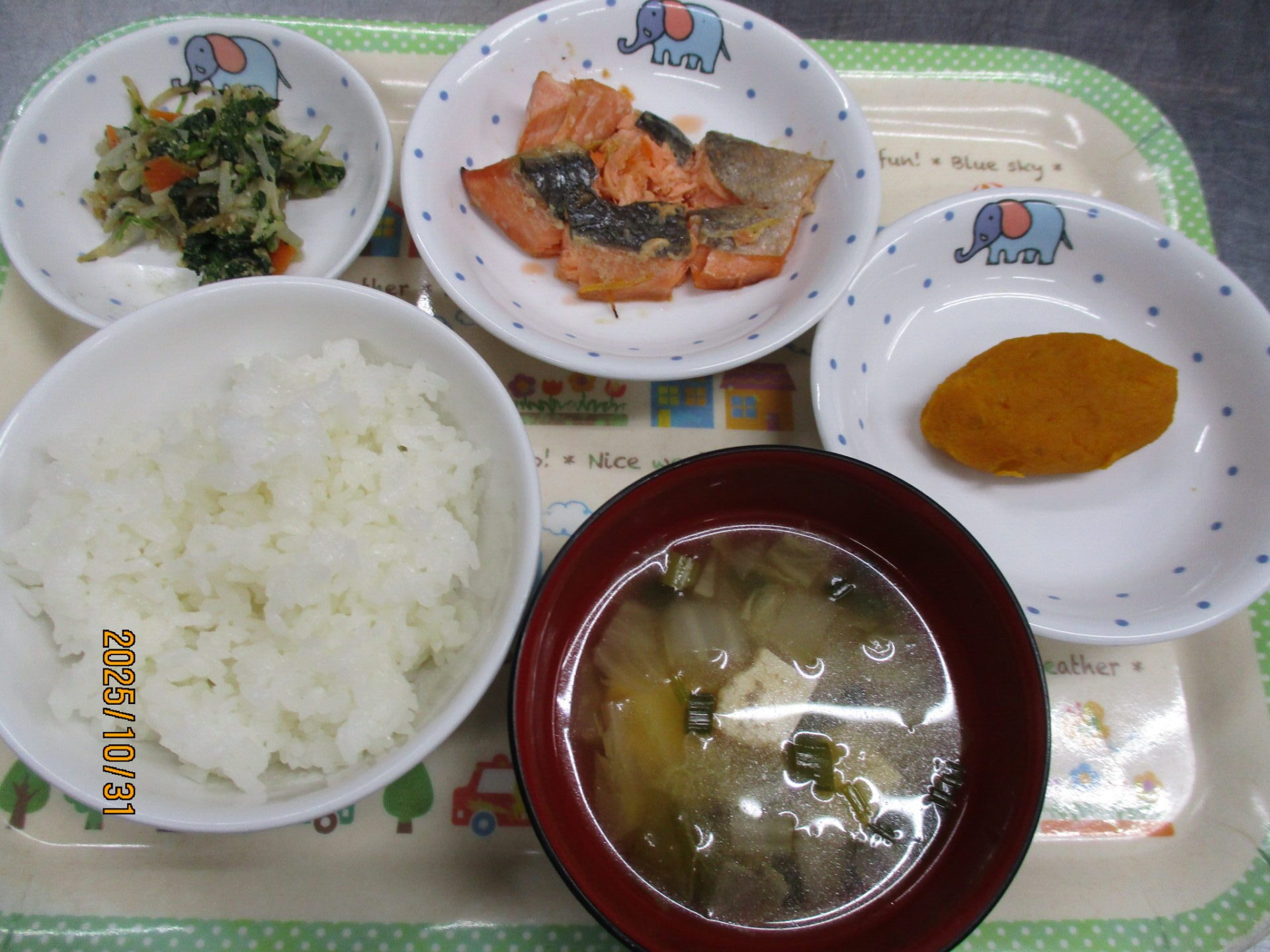 お昼ご飯:ごはん、みそ汁、さわらの幽庵焼き、ほうれん草ともやしのごま和え