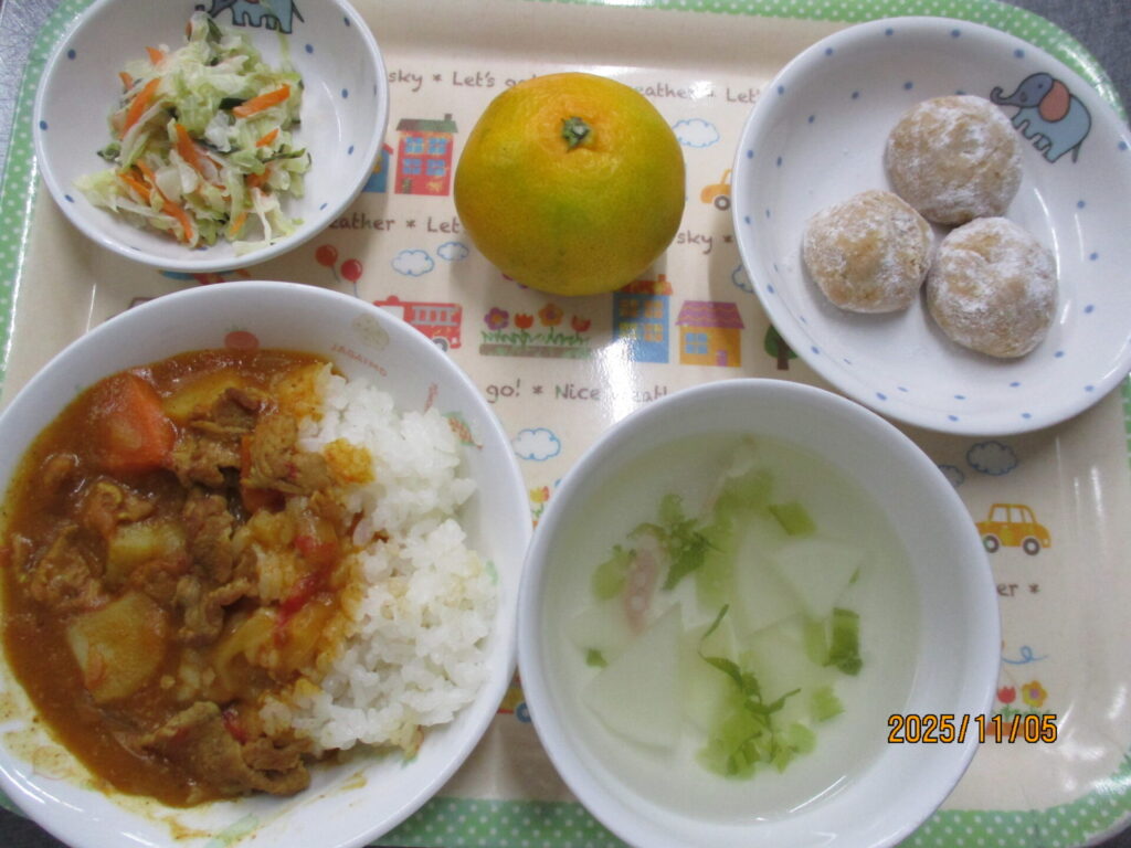 みんな大好きポークカレー calendar_today 2025年11月5日 お昼ご飯:ポークカレー、かぶのスープ、コールスローサラダ、みかん おやつ:スノーボールクッキー みんな大好きポークカレーの提供でした 朝から給食室からいい匂いが園内にだだよっていたのか 園児たちが合うたびに(今日はカレー⁈)と聞いてきます 教室では聞いてきた子どもが(今日カレーだってさー)って感じで みんな、何やらざわついていました 乳児さんも幼児さんもほとんど完食でした! かぶのスープとコールスローサラダも良く食べていました。 今シーズン最初のみかんも良く食べていました。