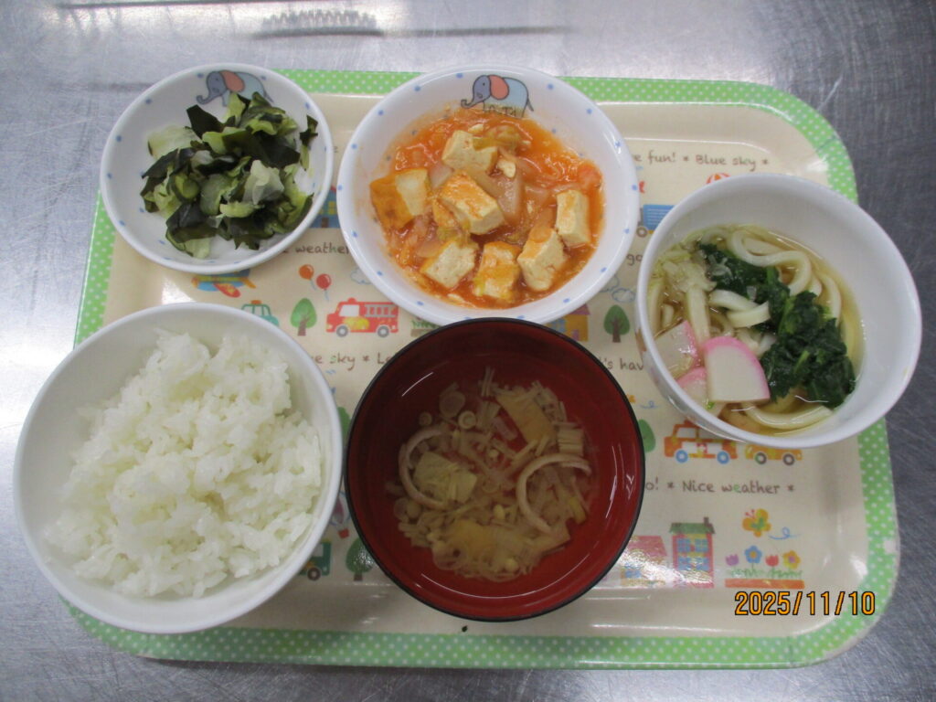 えびと厚揚げのチリソース calendar_today 2025年11月10日 給食:ご飯 すまし汁 えびと厚揚げのチリソース きゃべつときゅうりの酢の物 おやつ:かけうどん 今日の給食は優しい甘さのえびと厚揚げのチリソースです。えびと厚揚げに白菜もたっぷり入っています。じっくりと煮込んで味がしみていて子どもたちも良く食べていました。酢の物は少し残食多めです。おやつはかけうどんを提供しました。ベテルのうどんスープは出汁からしっかりと作り、優しい味に仕上げています。寒くなって来たので温かいうどんを喜んでくれていました。