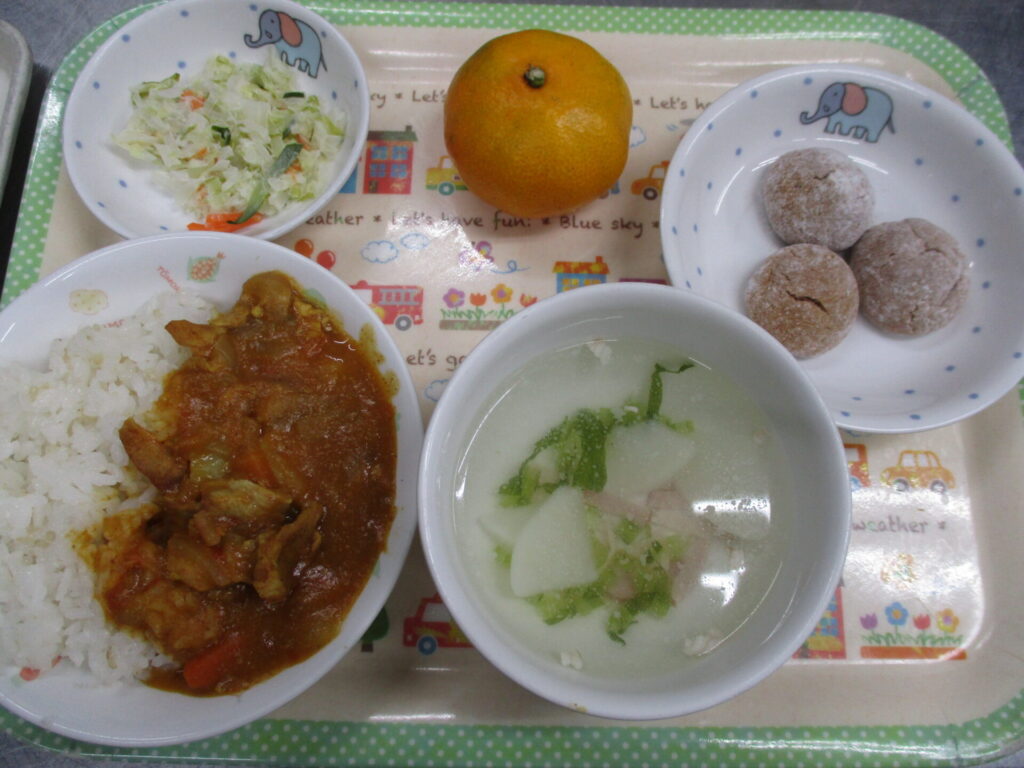 ポークカレー calendar_today 2025年11月19日 給食:ポークカレー かぶスープ コールスローサラダ みかん おやつ:スノーボールクッキー 今日は気温が一段と低く、晴れていたものの秋ではなく冬を感じる1日でした。 本日の喫食状況ですが、全体的にとても良く食べていました。サラダやスープの野菜もほぼ残っておらず、カレーは完食している子が とても多かったです。