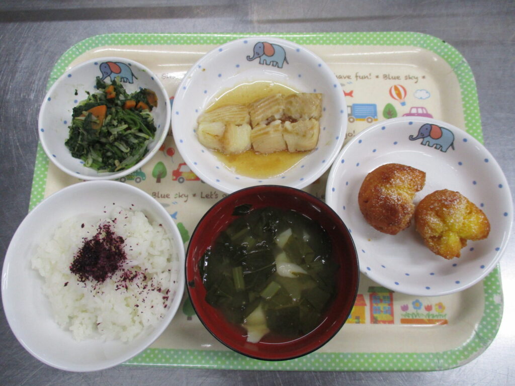 かぼちゃドーナツ calendar_today 2025年12月4日 給食:ゆかりご飯 みそ汁 かれいの煮つけ ほうれん草のお浸し おやつ:かぼちゃドーナツ 本日の給食はみそ汁には小松菜、お浸しにはほうれん草を使用していて緑が多かったからか残食が少し多めでした。かれいの煮つけは良く食べていました。おやつのかぼちゃドーナツにはかぼちゃの他におからも使用しています。おからがたっぷり入っているので軽い仕上がりになり、良く食べていました。今日はいつもと違う雰囲気で粉糖をかけて可愛らしい仕上がりにしました。