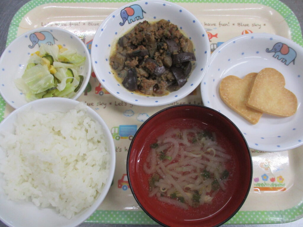 給食:ご飯、もやしスープ、麻婆茄子、三色サラダ、