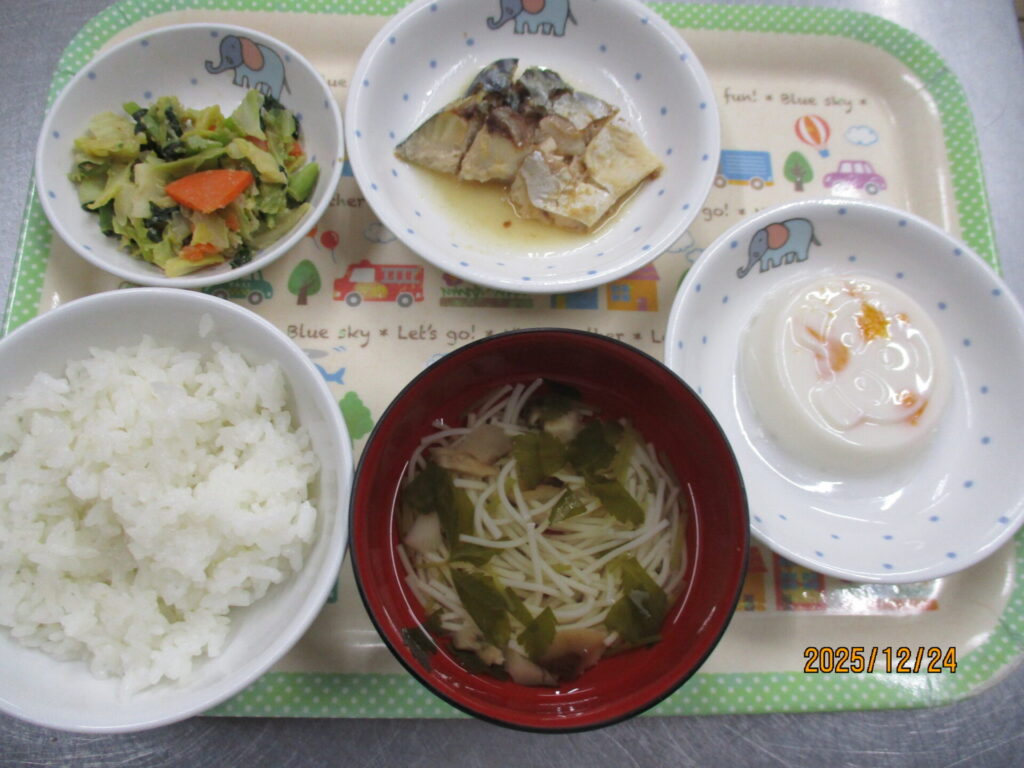 給食:ご飯 すまし汁 さばの梅みそ煮 小松菜のごま和え
