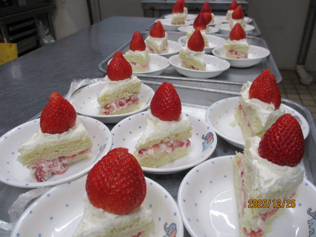 おやつはクリスマスケーキを提供しました。昨年から生地の配分を変えて作りましたが、しっとりとした美味しい