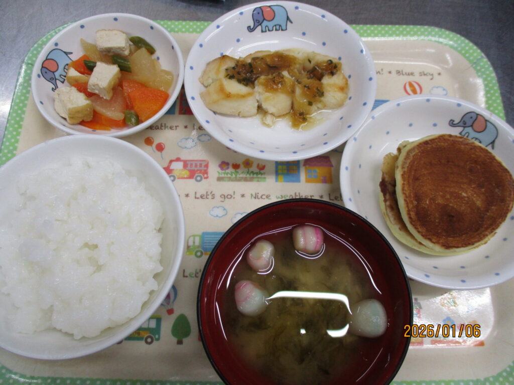 栗入りどら焼き calendar_today 2026年1月6日 給食:ご飯、みそ汁、かれいの香味焼き、厚揚げの煮物 おやつ:栗入りどら焼き 年明けから寒さが厳しくなってきましたが、寒くなればなるほど甘くなってくる野菜もあります その一つが長ねぎです その長ねぎが甘みがでるまでじっくり煮て生姜と大葉を加えてトロミをつけて 焼いたカレイに掛けました 食べやすいので子供たちもほぼ完食でした おやつは栗入りどら焼きでした 栗の甘露煮を刻んであんこに混ぜたものをどら焼きの皮に挟みました 明日は七草がゆの提供です 食べてくれるでしょうか!楽しみです
