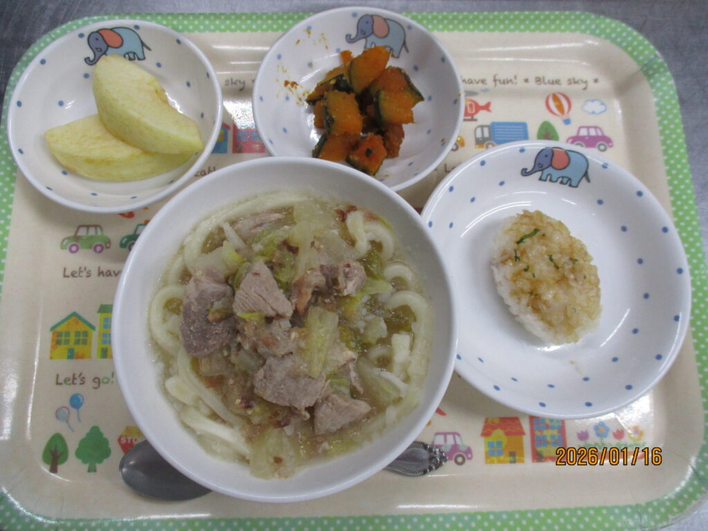 郷土料理 長野県 calendar_today 2026年1月16日 給食:おしぼりうどん 干しかぼちゃのごま和え りんご おやつ:こねつけ 本日は長野県の郷土料理を提供しました。 干しかぼちゃのごま和えは本来、雪が積もる時期にも食べられるように干しておいたかぼちゃを使用する料理ですが、園では一度蒸した かぼちゃをオーブンで熱風乾燥し、干しかぼちゃの風味に近づけました。 おやつのこねつけは炊いたご飯と小麦粉を混ぜて丸め、甘辛の醤油タレを塗って焼き上げました。