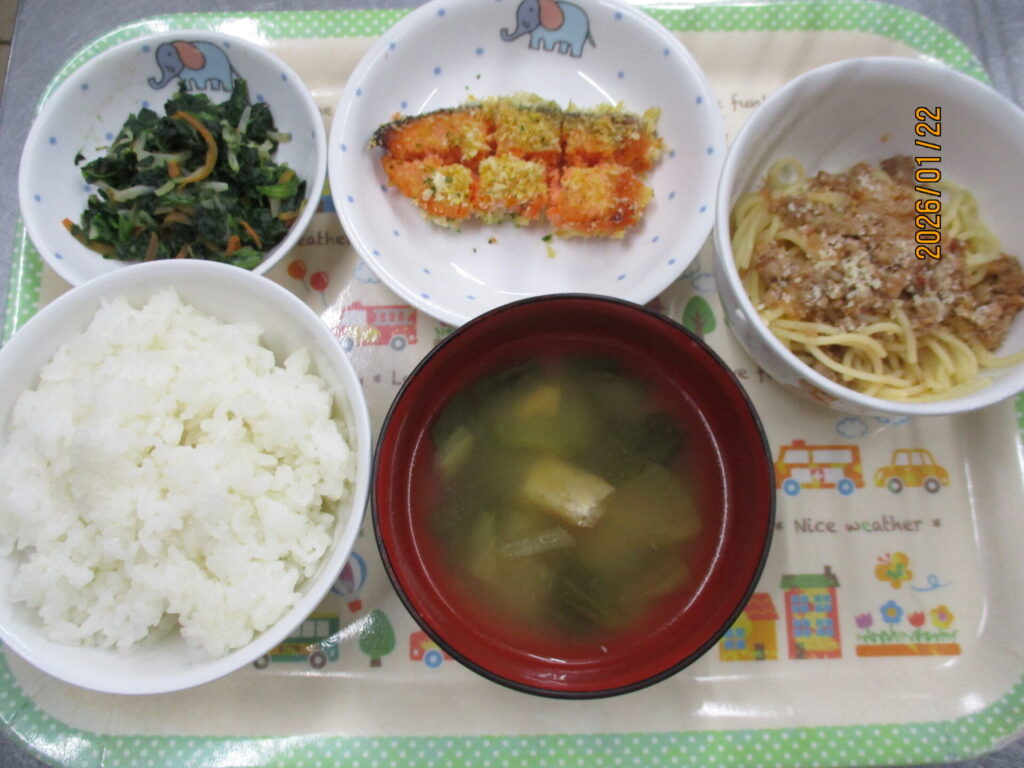 ミートソーススパゲティ calendar_today 2026年1月22日 給食:ご飯 みそ汁 鮭のカレーパン粉焼き ほうれん草のナムル おやつ:ミートソーススパゲティ 今日の給食はみんなが大好きなお魚メニューでした。鮭にチーズとカレー粉を混ざたパン粉をふりかけてこんがりと焼き上げました。残食も少なく良く食べていました。おやつのミートソーススパゲティも子ども達の大人気のメニューです。味付けはケチャップとコンソメだけのシンプルな味ですが、嬉しそうに食べてくれて残食もほとんど無く、きれいになったお皿がたくさん返ってきました。