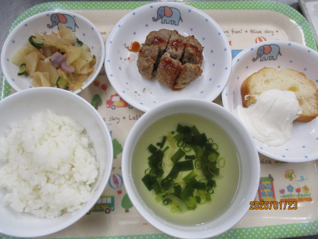 大根と胡瓜のツナ和え calendar_today 2026年1月23日 給食:ご飯 れんこんハンバーグ ねぎスープ 大根と胡瓜のツナ和え おやつ:りんごのパウンドケーキ 本日の喫食状況ですが、ハンバーグ、ツナ和えともに良く食べていました。 ツナ和えには園の畑で採れた三浦大根と赤大根を使用しました。園玄関の方にその他冬野菜とともに展示しているので、 お迎え時にぜひご覧ください。