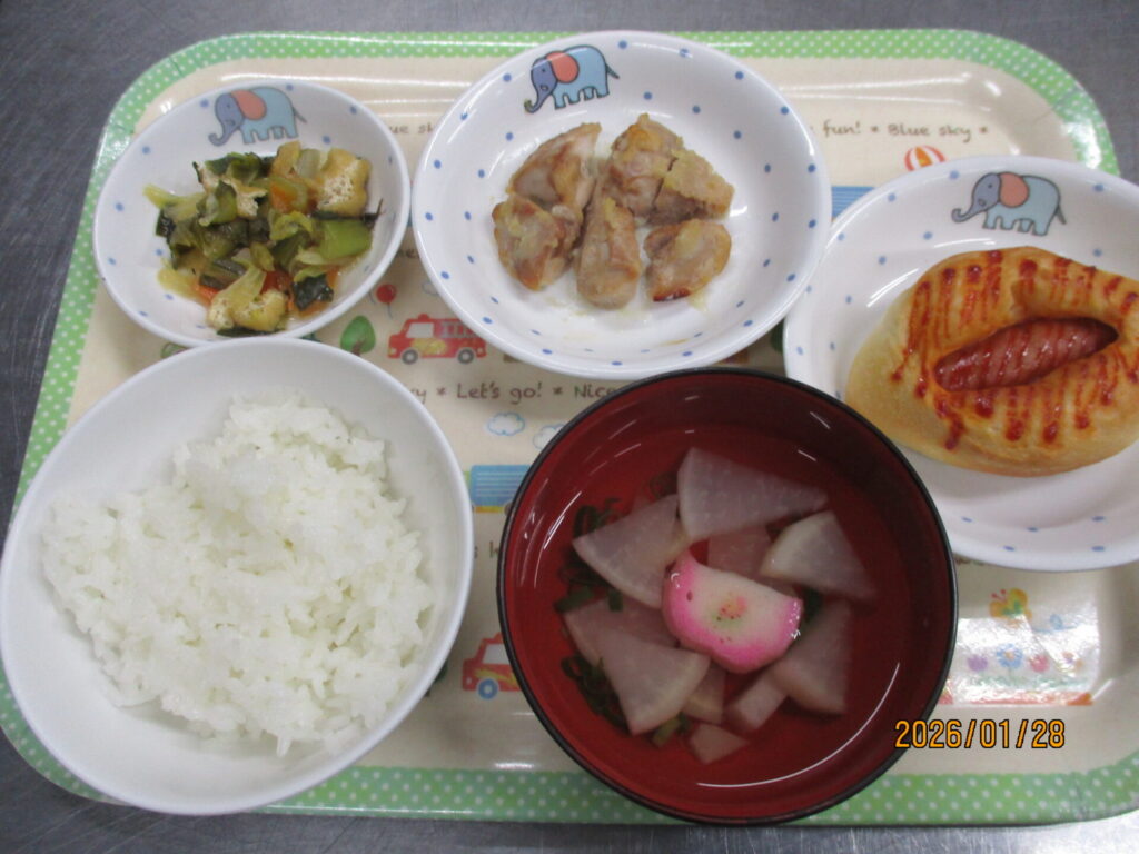 白菜の煮びたし calendar_today 2026年1月28日 早いもので一月もあと一日ですね 雨が降らないので野菜の生育にも影響がでてきています 白菜もそうで、巻きが詰まっていないものがでてきています ですが今が一番おいしい時期になっていますので煮びたしでの提供しました 白菜は加熱するとトロトロでうま味成分がまして美味しくなります 子ども達も野菜の副菜にしてはよく食べていました おやつのウインナーパンは大人気で、あっという間に食べていました 人も乾燥対策して食べ物から栄養をとって風邪をひかないように気を付けましょう