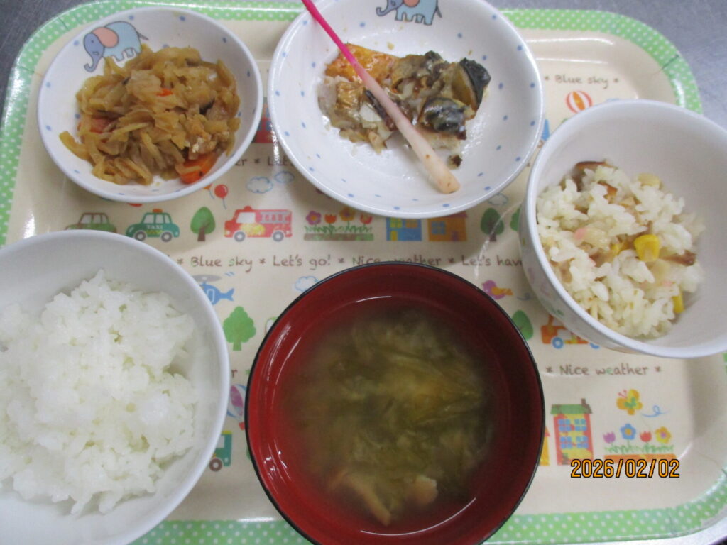 鯖の塩焼き calendar_today 2026年2月2日 給食:ご飯、みそ汁、鯖の塩焼き、切干大根の煮物 おやつ:チャーハン 早いもので、もう二月になりました! まだまだ寒いですが、梅の花もほころび始め春の足音が聞こえてきました 今日は、寒さばの塩焼きの提供でした 魚のおいしさを引き出す塩焼きなので、子どもたちもよく食べていました 切干大根の煮物も、甘しょっぱいみんな大好きな味付けで残食も少なめでした チャーハンも食べているところを見に行った職員に「美味しー!」と言ってもらえました