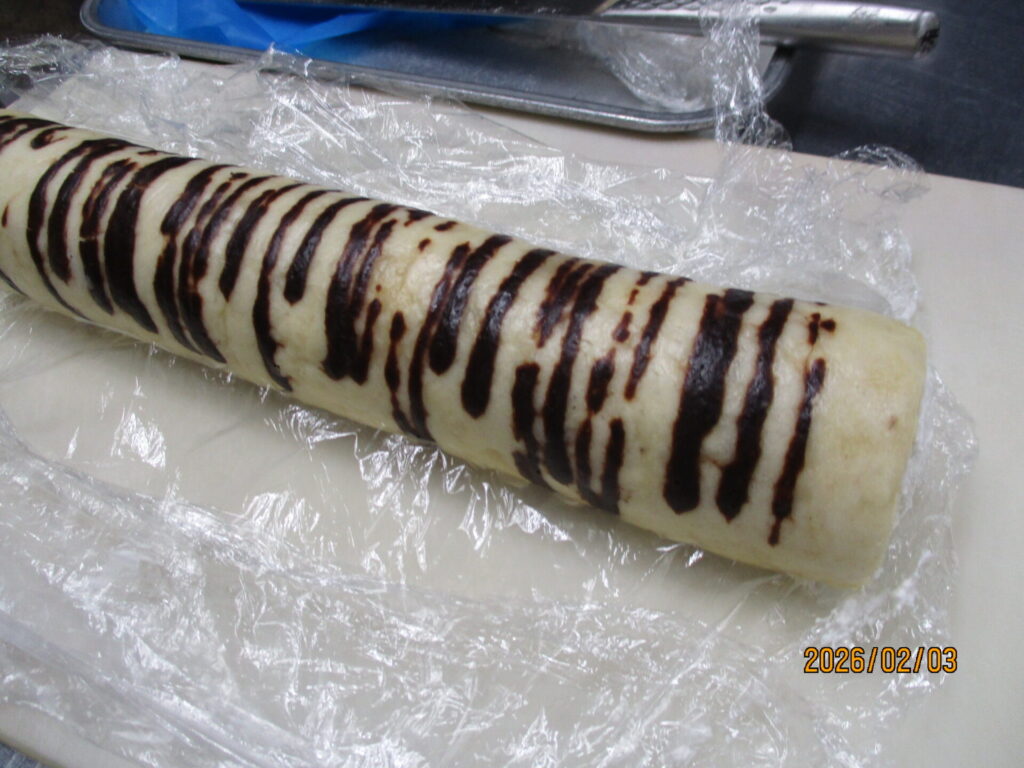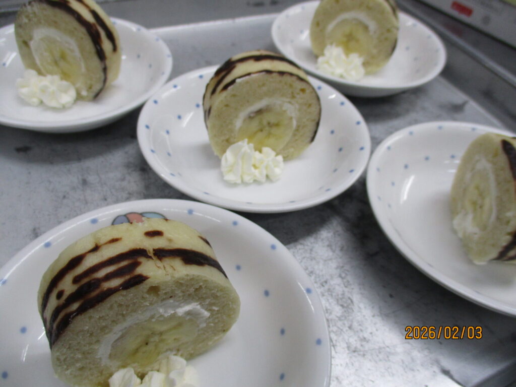 おやつ・新メニュー! calendar_today 2026年2月3日 給食:ご飯 すまし汁 鶏肉の梅煮 わかめの酢の物 おやつ:恵方ケーキ 今日も日差しが暖かく、子どもたちは元気いっぱいに過ごしていました。給食は和食のさっぱりとしたメニューで残食は少なく良く食べていました。おやつは節分という事もあり、新作のロールケーキを提供しました。恵方なので鬼のパンツ・トラ柄で作ってみました!生地を卵を使用しなくても巻ける生地に仕上げ、生クリームとバナナを中に巻きました。子供たちは美味しい!と嬉しそうに食べてくれました。