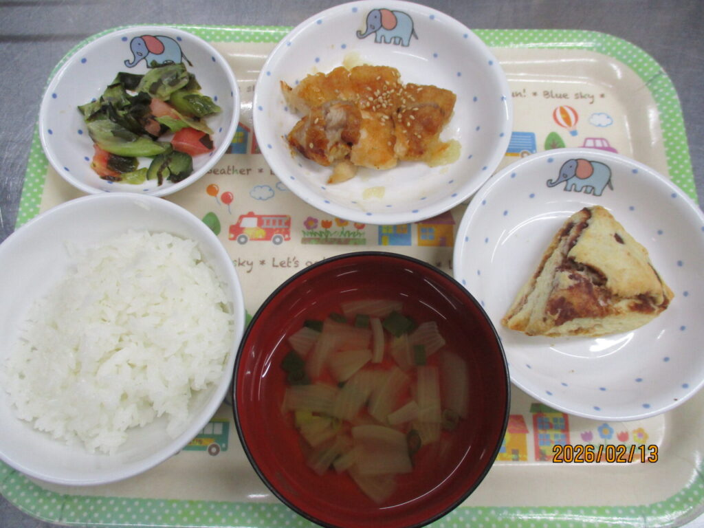 小倉スコーン calendar_today 2026年2月13日 給食:ご飯 中華スープ ヤンニョムチキン チョレギサラダ風 おやつ:小倉スコーン 今日の給食は人気メニューのヤンニョムチキンです!タレはケチャップや醤油が入り、甘辛の味付けです。鶏肉は揚げてはいませんが、片栗粉をはたき、油をかけ回して揚げ焼きの様にする事でヘルシーに仕上げ食感を近付けています。おやつは小倉スコーンです。スコーン生地を折っていく中間あたりであんこを挟み、さらに2回折って何層にもなるように焼き上げました。あまり生地を触り過ぎないようにするときれいな層になります!