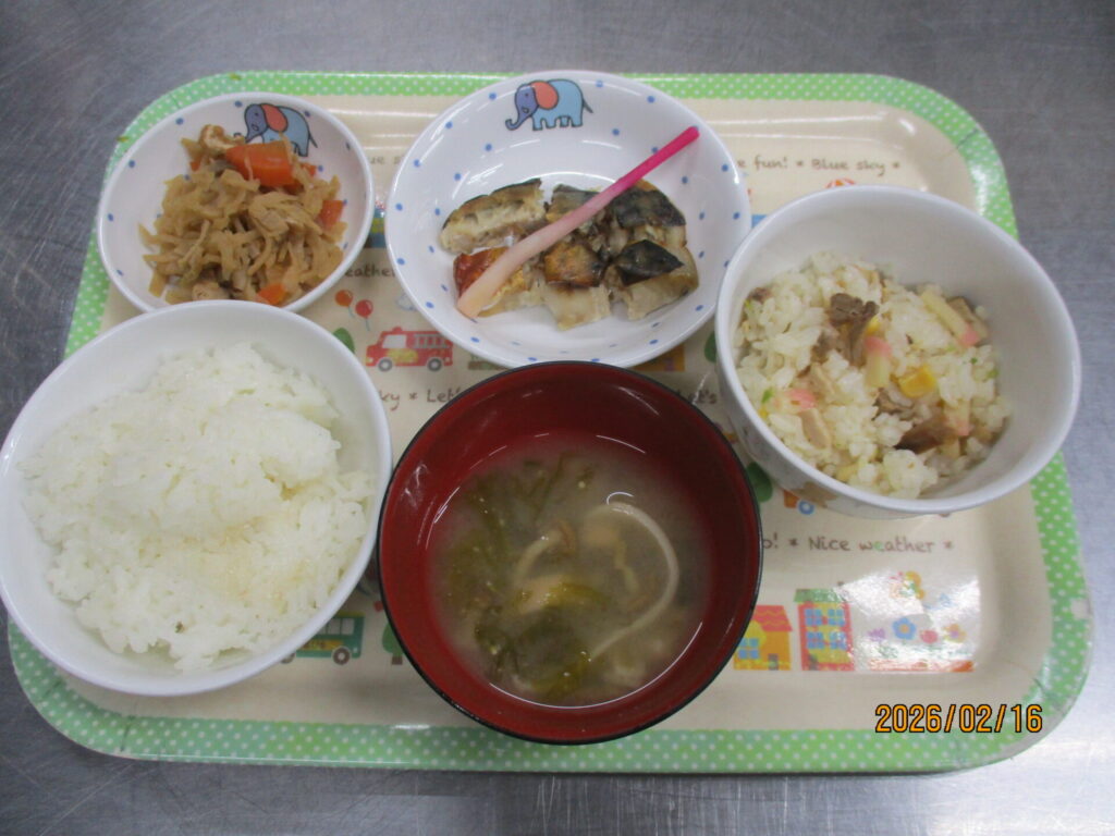 さばの塩焼きとはじかみ calendar_today 2026年2月16日 今日も昨日と同じく春の暖かさが感じられる一日でした 今日はさばの塩焼きの提供でした、魚の塩焼きはいつも良く食べてくれています 幼児クラスには、あしらえとしてはじかみを添えています 葉しょうがの酢漬けなのですが、ほとんどの子が食べていて 中にはちょっとずつ食べていたり、ちゅうちゅうしながら食べている子もいます 食べているところを見に行くと発見があって面白いです 切干大根煮も良く食べていました おやつのチャーハンも良く食べていました