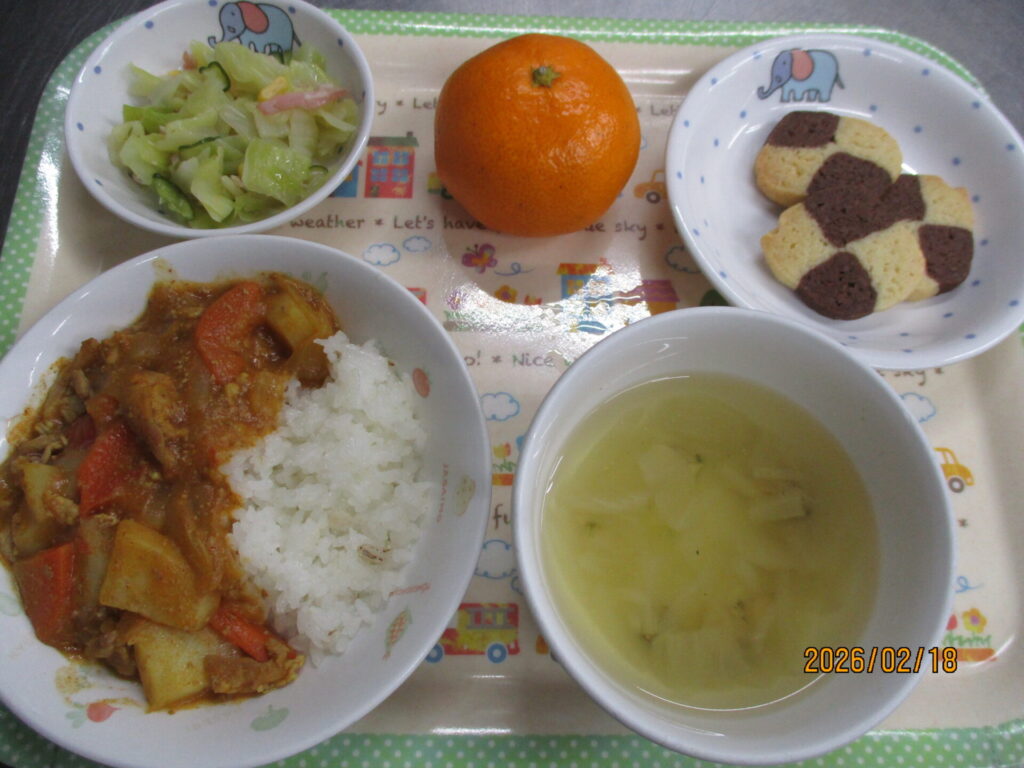 カレーライスの日‼ calendar_today 2026年2月18日 給食:ポークカレー、オニオンスープ、コーンサラダ、みかん おやつ:二色クッキー 今日は、みんな大好きなカレーの日でした カレーの日は、子供も大人もみんなワクワクして給食の時間を待っています カレーのときは、副菜の野菜も良く食べてくれています ミカンもみんな大好きで喜んで食べてくれていました おやつの二色クッキーも見た目が可愛いと言って食べてくれていました