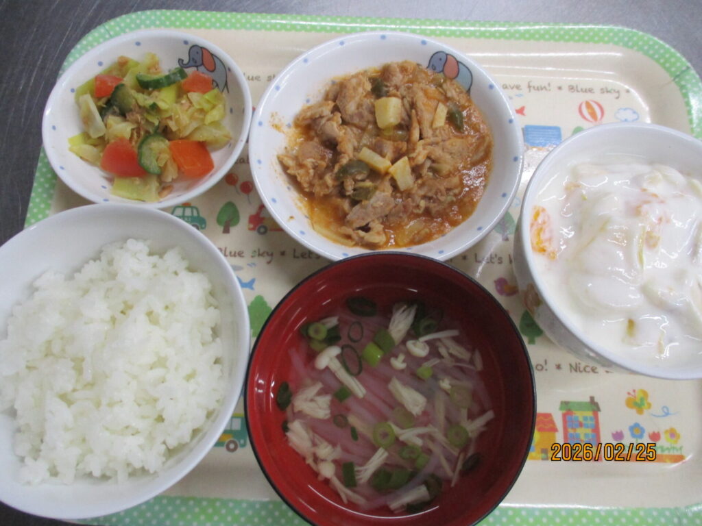 酢豚風煮 calendar_today 2026年2月25日 久しぶりにまとまった雨が降って恵みの雨になりました 人間にもですが、生き物すべてに水は必要ですからね 今日の給食は、中華でした 春雨スープは、ちゅるちゅるの春雨がみんな大好きでほとんどの子が完食してました 酢豚風煮も、酸味を抑えた味付けのケチャップ味でよくたべていました 中華サラダも、ツナが入っていて食べやすかったのか良く食べていました おやつのフルーツヨーグルトも、いつもどおり喜んで食べてくれていました 今日は、全体に残食が少なかったように思います。