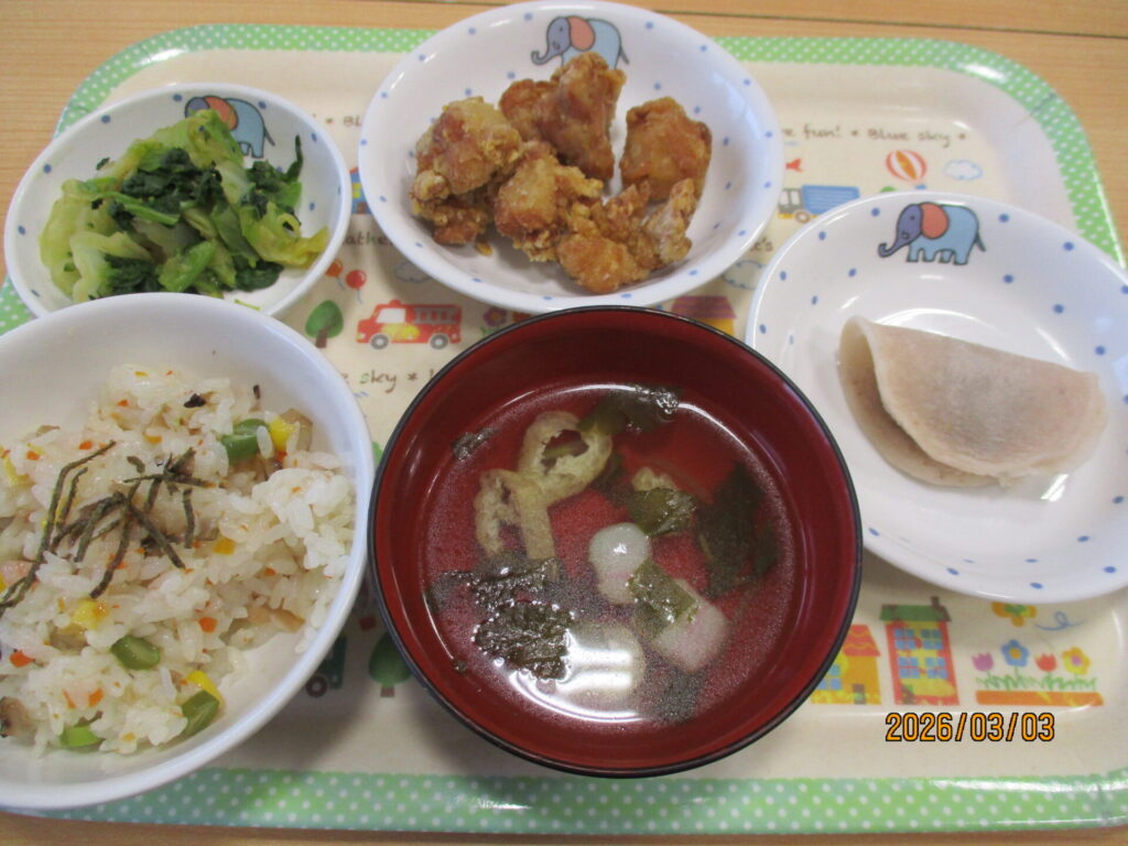 今日の給食はひな祭りメニューの提供でした。ちらし寿司は7種類の具材を使用し、甘めの合わせ酢で味付けしました。いつも酢飯だと苦手な子が多かったりするのですが、今日は良く食べていました。鶏のからあげは大人気!乳児クラスはほとんど残食なし、幼児クラスは残食なしの完食でした!おやつは米粉と片栗粉を使用し、1枚ずつ焼き上げその後スチームで蒸しています。もち米は使用していませんが、もちもちとした仕上がりで子ども達も良く食べていました。
