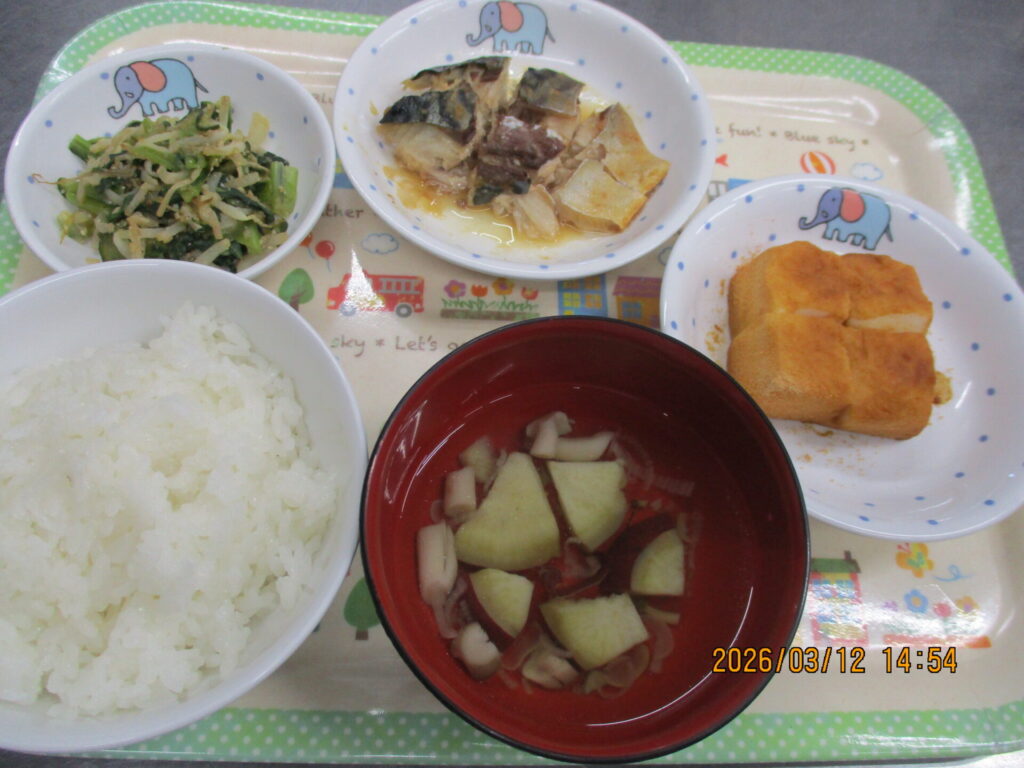 給食:ご飯、すまし汁、サバの味噌煮、もやしのごま和え