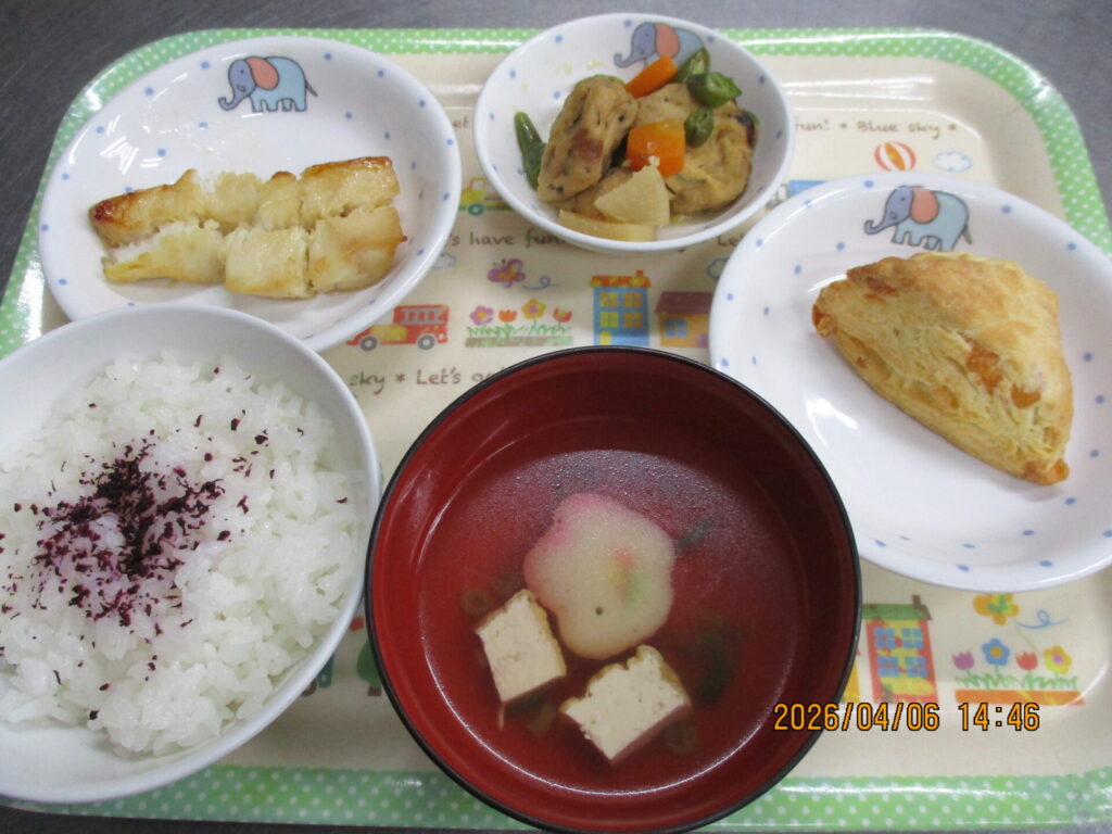 今日は暖かく良い天気になり、子ども達は外で元気いっぱいに遊んでいました!お腹すいた~と園内に入ってくる子どもたち。みんな良く食べていて、かれいはほぼ完食、がんもの煮物も良く食べていました。おやつのスコーンもチーズだ!と喜んでいて、どのクラスも残食はほとんどありませんでした。いつも有塩バターでスコーンを作りますが今日はあえて無塩バターを使用し、最初は甘い香り、食べていくとチーズのしょっぱさを感じる仕上がりになっています。
