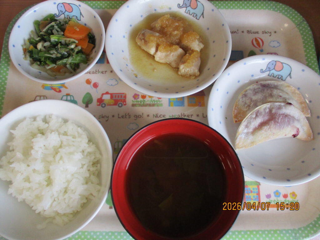 菜の花の青のり和え calendar_today 2026年4月7日 給食:ご飯 みそ汁(赤みそ) 鶏肉のみぞれ煮 菜の花の青のり和え おやつ:ブルーベリー餃子パイ 今日の給食は春の野菜・菜の花を使った青のり和えの提供でした。人参で彩りを加えてみましたが、緑のお野菜はどうしても残食が多めになってしまう傾向に…。ちょっとした変化で食べよう!となってくれる事も多々あるので、これからも色々な味付けや組み合わせに挑戦していきます!みぞれ煮は大根が苦手な子でも大根おろしなら好き!という子もいて良く食べていました。