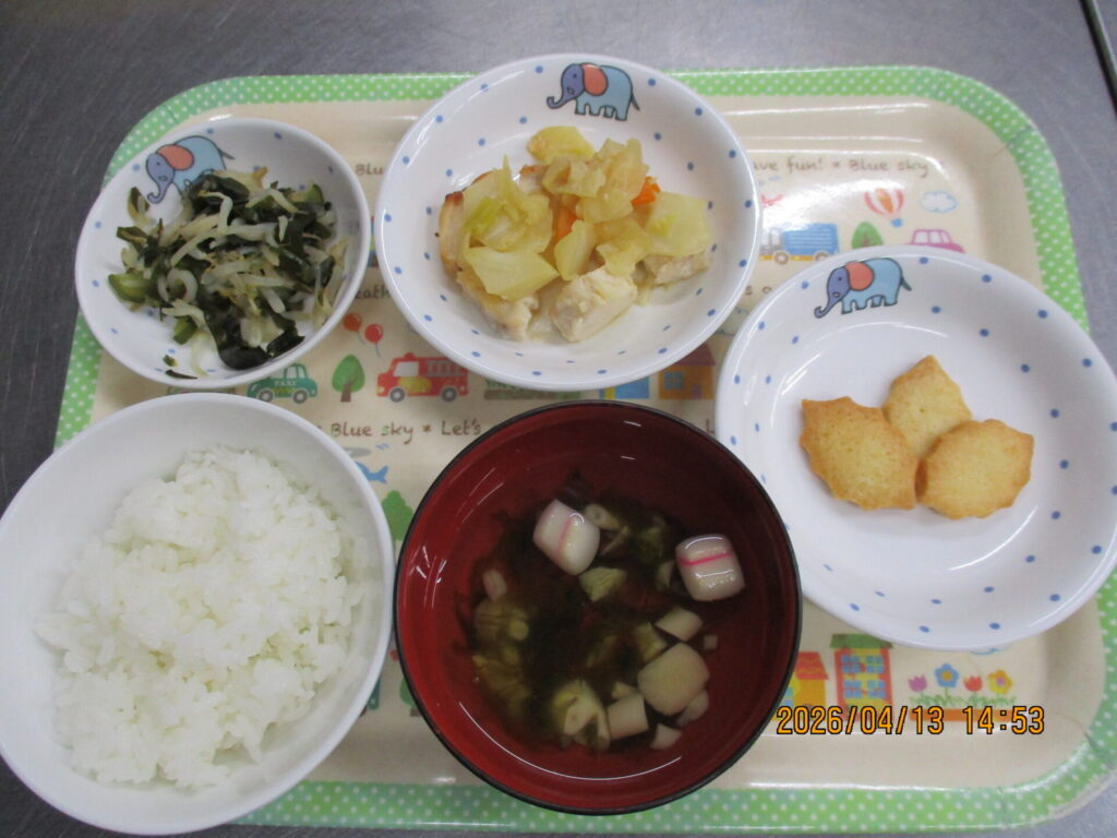 メープルクッキー calendar_today 2026年4月13日 給食:ご飯 すまし汁 春キャベツのちゃんちゃん焼き わかめの酢の物 おやつ:メープルクッキー 今日の給食は春野菜たっぷりの和食の提供でした。柔らかく美味しいかじきと甘めの味噌味で子ども達も良く食べていました。わかめの酢の物、すまし汁も良く食べていて残食少なめでした。おやつのクッキーは甘いメープルの香りがしてみんな美味しそうに食べていました!