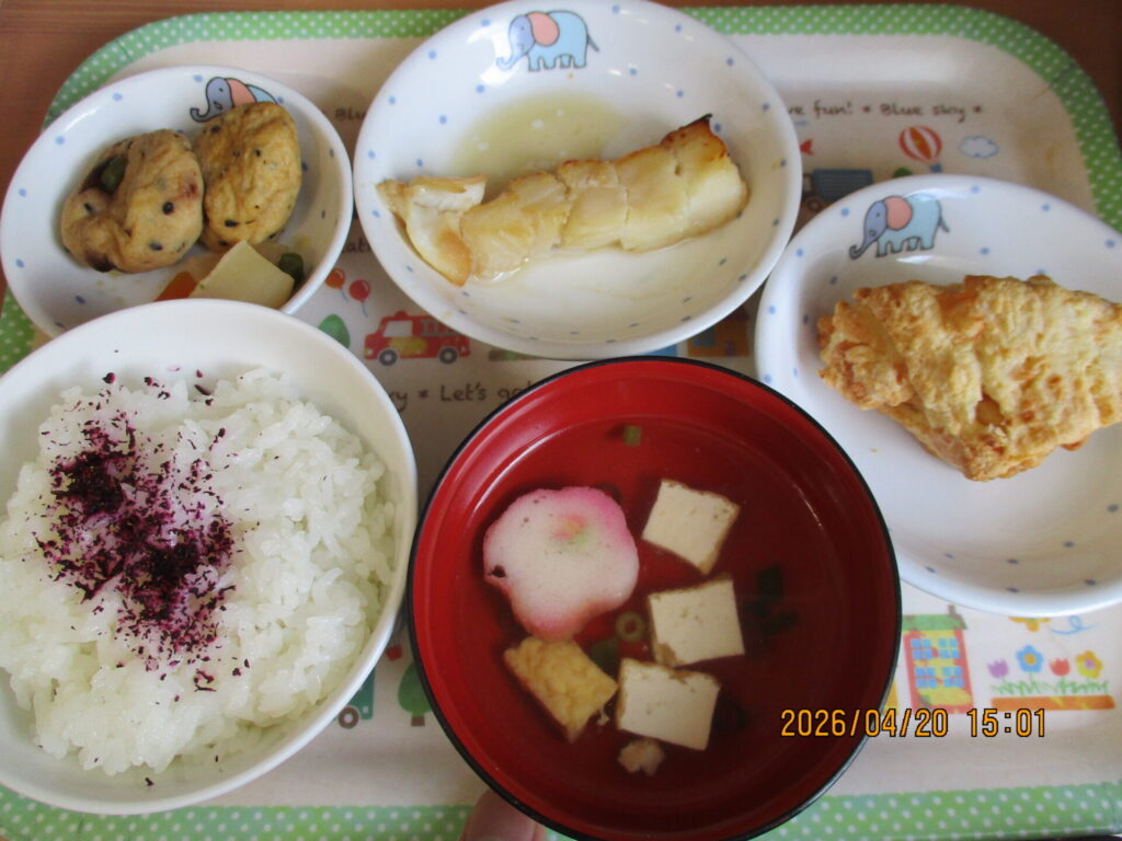 がんもの煮物 calendar_today 2026年4月20日 給食:ゆかりご飯 すまし汁 かれいの照り焼き がんもの煮物 おやつ:チーズスコーン 本日は雲が多かったものの、とても暑く少し動くだけで汗ばむような一日でした。 お昼に提供したがんもの煮物は園で採れた筍を加えて提供しました。ここまでで既に20本以上採れていますが、現在も園敷地内に10~ 20本の筍が生えてきてます。 とんでもなく豊作の年と言えそうです。筍は豊作と凶作が交互に来るそうなので今から来年が心配です、、、。