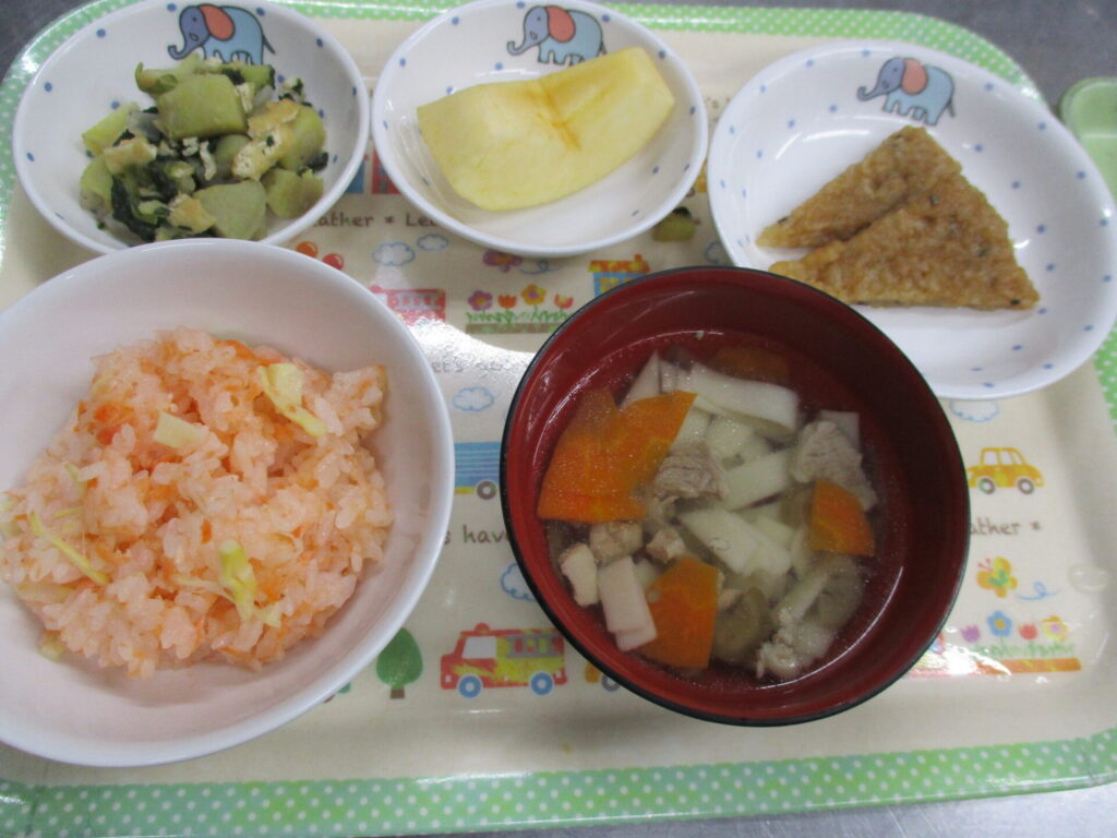 青森県の郷土料理! calendar_today 2026年4月24日 給食:鮭の飯ずし ひっつみ(汁) ねりこみ りんご おやつ:がっぱらもち 今日の給食は月に1度の郷土料理の日でした。 「鮭の飯ずし」は鮭の旨みとベテル保育園産のたけのこがとても美味しく、子ども達も とても良く食べていました。 「ひっつみ」にはきしめんが入っていてつるりと飲み干していました。 おやつの「がっぱらもち」は炊いたご飯に小麦粉とごまを混ぜこみ、表面をカリッと焼いて 甘いタレを塗って完成です。 少し苦手そうな子もいましたが、全体的に良く食べていました。