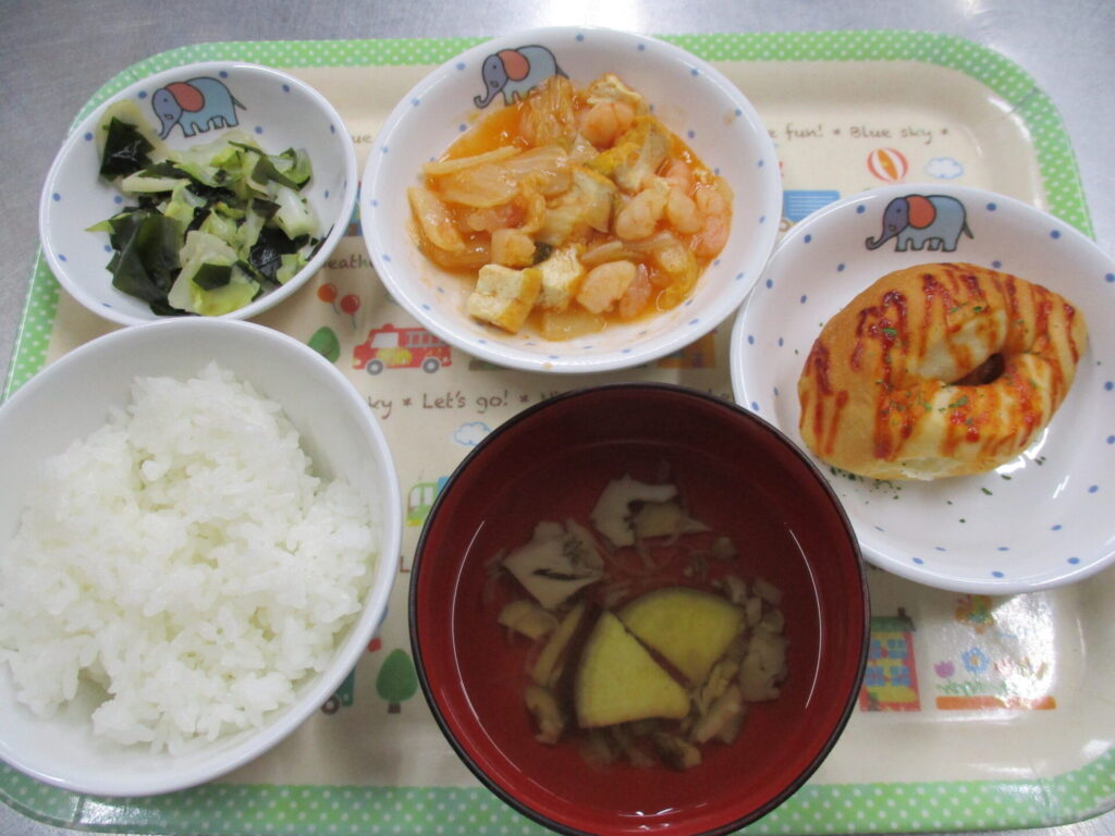 給食:ご飯 すまし汁 えびと厚揚げのチリソース きゃべつとわかめの和え物