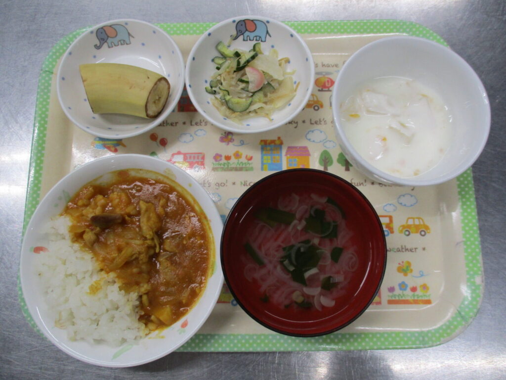 みんな大好きチキンカレー!! calendar_today 2026年4月28日 給食:チキンカレー ねぎスープ 大根ラディッシュサラダ バナナ おやつ:フルーツヨーグルト 今日はみんなが大好きなチキンカレーを提供しました。 カレーのいい匂いが保育園中に広がり、ワクワクしながら給食を待っていました。 「おいしかったよ~」とたくさん伝えてくれました。 おやつではさっぱりとしたフルーツヨーグルトが冷たくて美味しかったようです。