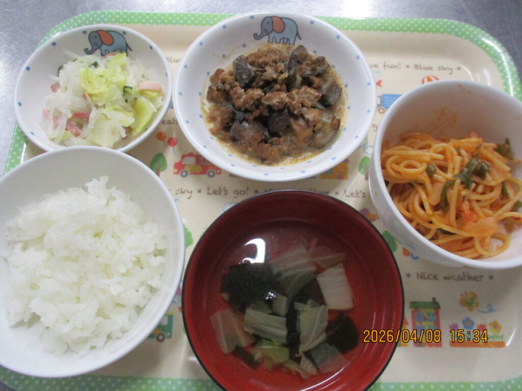 給食:ご飯、わかめスープ、麻婆茄子、春雨サラダ