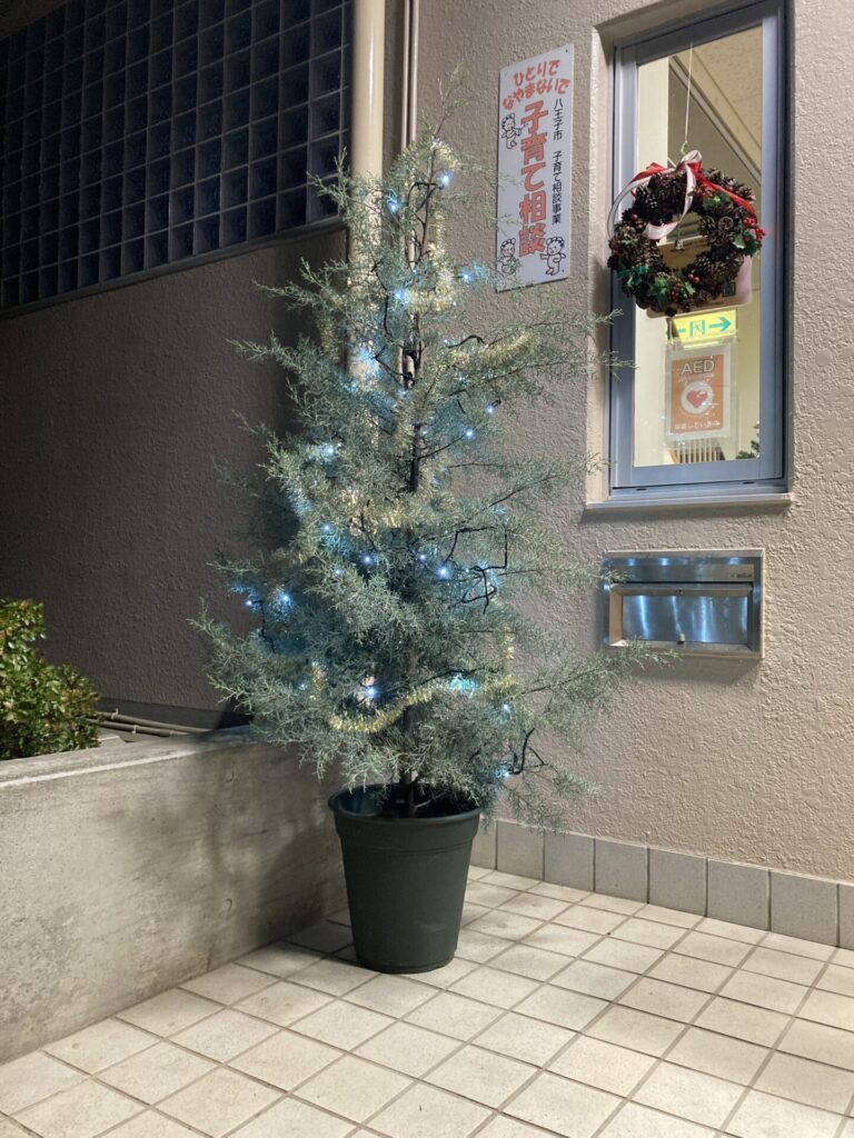 クリスマスツリー calendar_today 2025年12月3日 当園の園庭の木を植栽していただいている「やましたグリーン」さんから、クリスマスツリーをいただいたので、デコレーションしてみました。園の正面玄関に飾っています。24時間点灯中!!